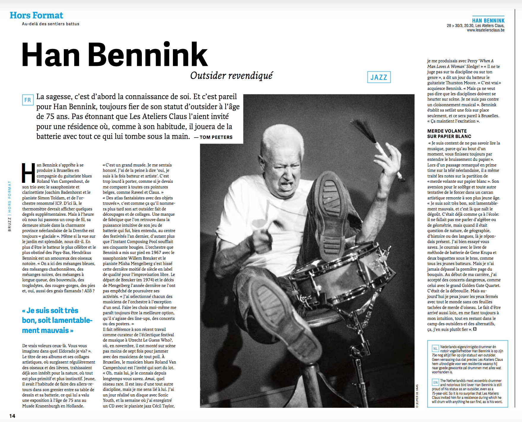 Han Bennink is well-known as a drummer, but not many people know that he is also a visual artist, and considers himself as a servant of two masters: music and art. He never studied music, but he does have a diploma from art school! Now that he's turned 75, there will be a major exhibition of his art work, opening in October 2017 at the Museum Kranenburgh in Bergen.